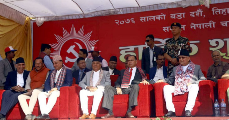 सत्तारूढ दल नेपाल कम्युनिस्ट पार्टी (नेकपा) ले बुधबार राजधानीमा आयोजना गरेको चियापान कार्यक्रममा चीनका राष्ट्रपति सी जिनपिङको भ्रमणदेखि सभामुख कृष्णबहादुर महरा पक्राउसम्मको चर्चा भएको पाइएको छ । उक्त अवसरमा सत्तारूढ दल नेकपाका अध्यक्ष समेत रहेका प्रधानमन्त्री केपी शर्मा ओली र अर्का अध्यक्ष पुष्पकमल दाहाल ‘प्रचण्ड’ ले चिनियाँ राष्ट्रपति सीको नेपाल भ्रमणमा भएका उपलब्धिको चर्चा गरे ।