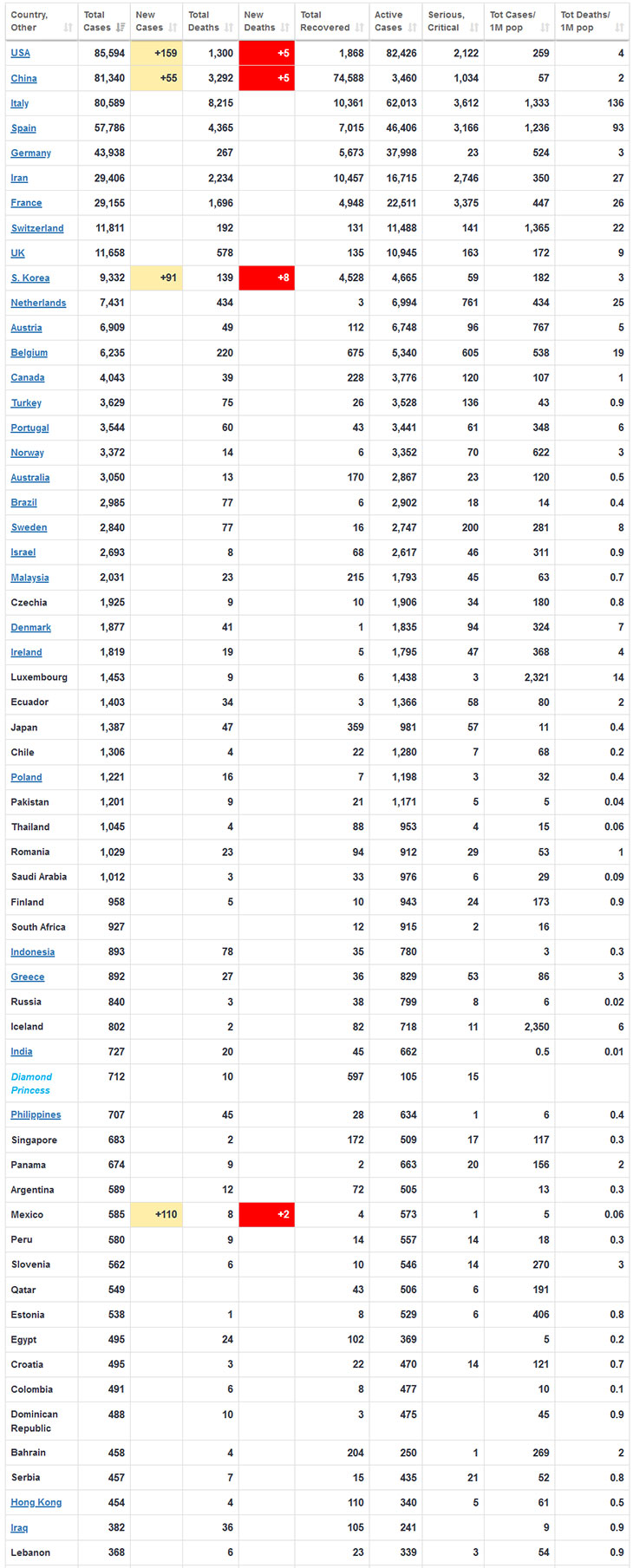 शुक्रबार बिहानसम्मको तथ्यांकमा संक्रमितहरूको संख्याका हिसाबले अमेरिका पहिलो नम्बरमा छ । हालसम्म अमेरिकामा ८५५९४, चीनमा ८१३४०, इटालीमा ८०५८९, स्पेनमा ५७७८६, जर्मनीमा ४३९३८, इरानमा २९४०६, फ्रान्समा २९१५५, स्विट्जरल्याण्डमा ११८११ र बेलायतमा ११६५८ जना कोरोनाभाइरसका संक्रमित फेला परेका छन् ।