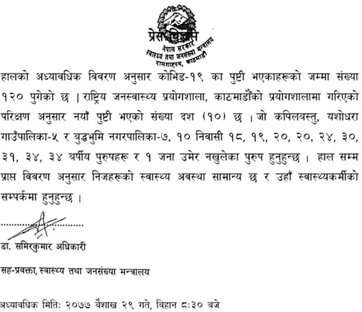 मन्त्रालयका अनुसार यशोधरा गाउँपालिका– ५ र बुद्धभूमि नगरपालिका– ७ तथा १०, कविलवस्तुका १० जनामा कोरोनाभाइरसको संक्रमण देखिएको हो । संक्रमितहरु १८, १९, २०, २० २४, ३०, ३१, ३४ र ३४ वर्षका पुरुष रहेको र एक जनाको उमेर नखुलेको मन्त्रालयले जनाएको छ । उनीहरु सबैको स्वास्थ्य अवस्था सामान्य रहेको र स्वास्थ्यकर्मीको सम्पर्कमै रहेको पनि मन्त्रालयले जनाएको छ ।