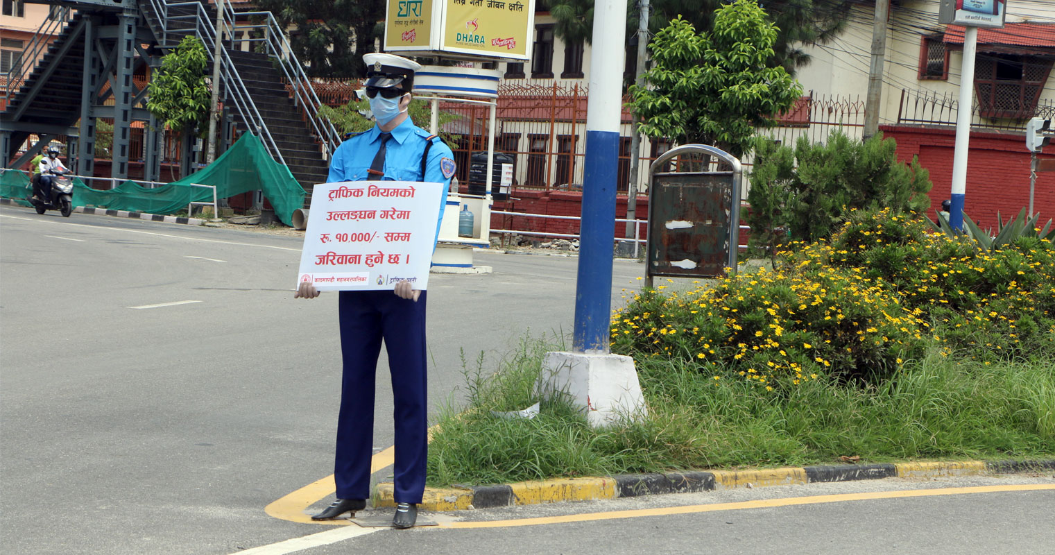 नजिकैबाट नियाल्दा पो थाहा भयो– ती ‘ट्राफिक’ त वास्तविक प्रहरी नभई निर्जीव ‘डमी’ मात्रै पो रहेछन् । एकातिर काेराेनाभाइरस महामारीकाे राेकथाम तथा नियन्त्रणका लागि भन्दै चर्काे निषेधाज्ञा लागू गरिएकाे छ भने अर्कातिर सुनसान राजधानीका सडकमा सवारी चालकहरुलाई चेतावनी दिन चाेक–चाेकमा धमाधम ‘डमी ट्राफिक’ राखिएका छन् । सवारी चालकहरुले सडक नियमकाे पालना नगरे चर्को जरिवाना तिर्नुपर्ने ‘मूल्यसूची’ सहित काठमाडौं महानगरपालिकाद्वारा जारी सूचना बोकेर उभिएका ‘डमी ट्राफिक’ राजधानीका माइतीघर, काेटेश्वर, जडीबुटी, गाैशाललगायतका विभिन्न मुख्य–मुख्य चोकमा खडा छन् ।