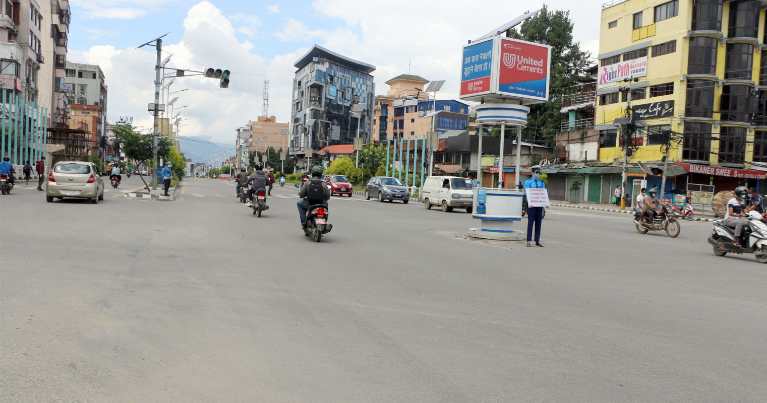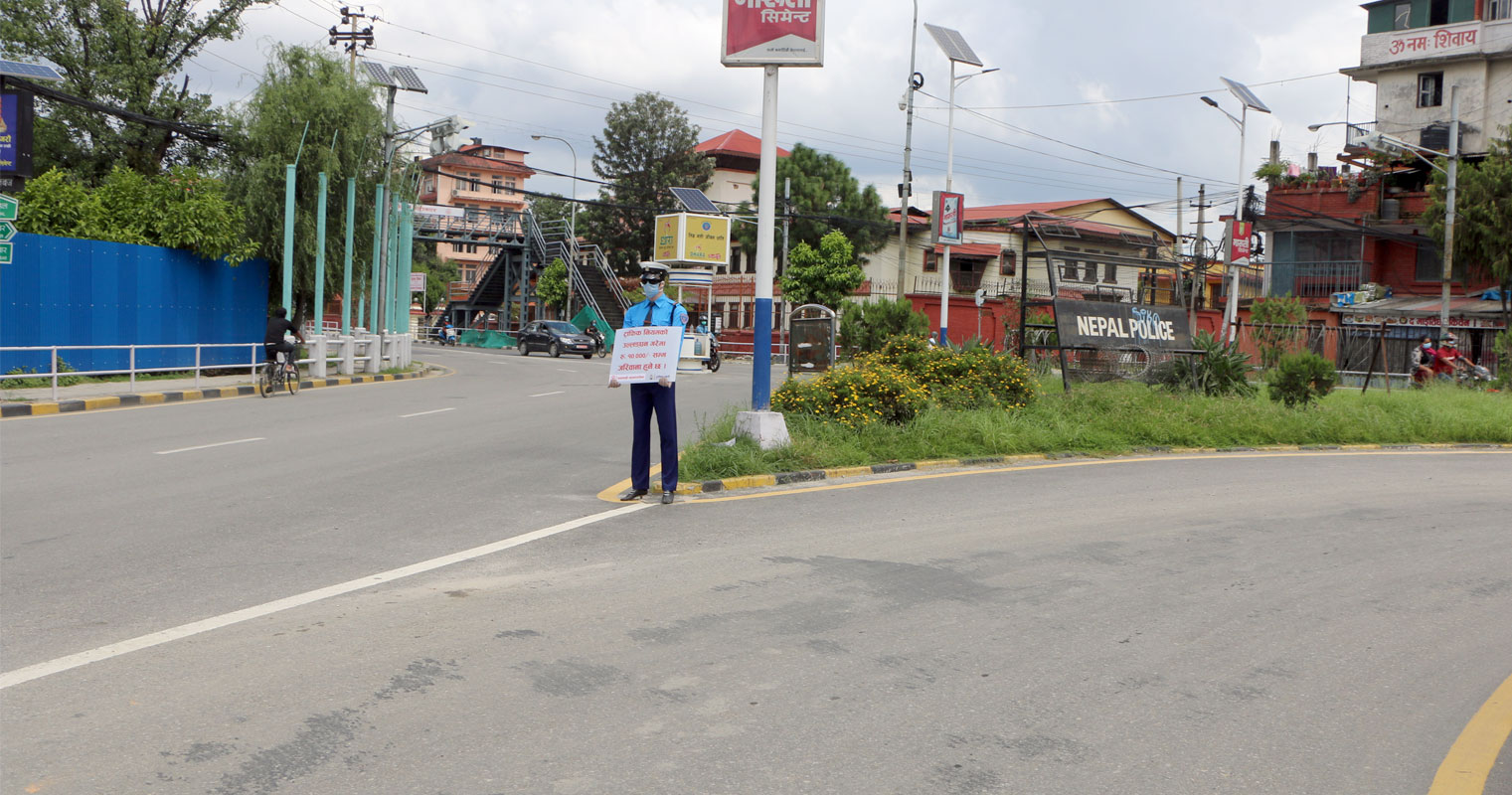मंगलबार अपराह्न । राजधानीको नयाँ बानेश्वर चोकमा पानी दर्किरहेको थियो । ड्युटीमा रहेका ट्राफिक प्रहरीहरु चोकभन्दा दायाँ–बायाँका घरहरुको आडमा च्यापिएर ओत लागिरहेका थिए । तर, एक ट्राफिक प्रहरी भने दुई हातले ठूलो सूचना थाम्दै बीच सडकमै उभिइरहेका देखिए । उनले न छाता ओढेको थिए न त रेनकोट नै पहिरिएका ।