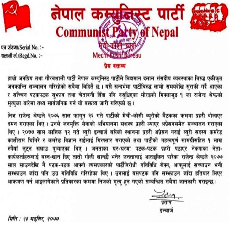 मेची–कोशी ब्युरोका इन्चार्ज प्रतापले मंगलबार जारी गरेको विज्ञप्तिमा आफ्नो पार्टीका नेता–कार्यकर्ताहरू र पार्टीविरोधी गतिविधि गरेका उनलाई सम्झाउन खोज्दा प्रतिकार गरेकाले मृत्यु हुन पुगेको उल्लेख छ ।