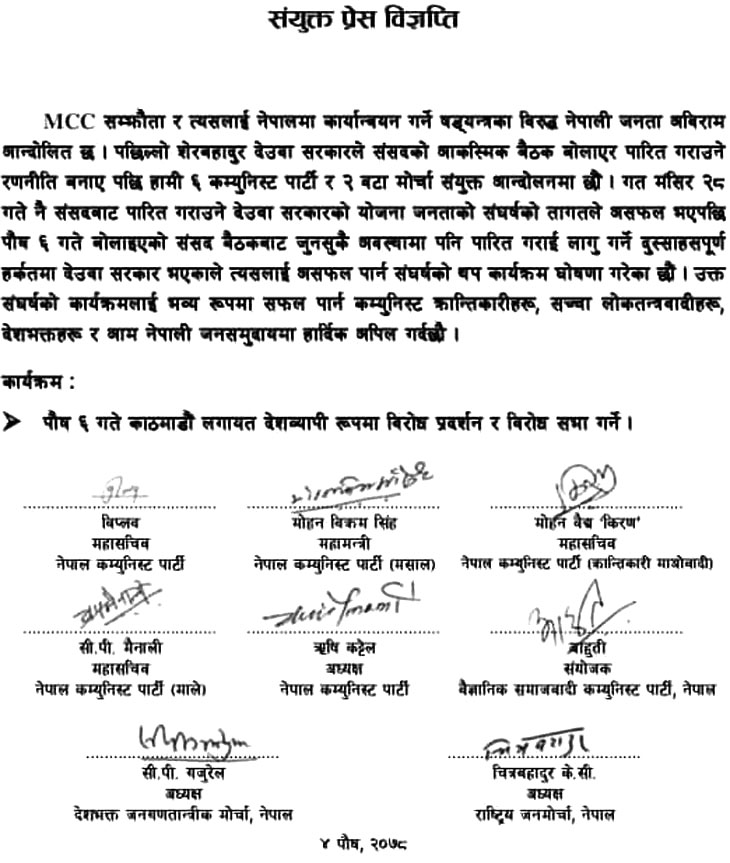 नेपाली जनताले व्यापक विरोध गरिरहेको अमेरिकी सहयोग नियोग एमसीसीलाई कुनै न कुनै हिसाबले संसदबाट अनुमोदन गराउन कांग्रेस–एमालेलेलगायतले गरिरहेको अधिकतम प्रयासका विरूद्ध नेपालका ६ वटा कम्युनिस्ट घटकहरू र २ वटा क्रान्तिकारी मोर्चाहरूले देशव्यापी संघर्ष अघि बढाएका छन् ।