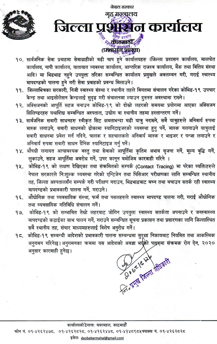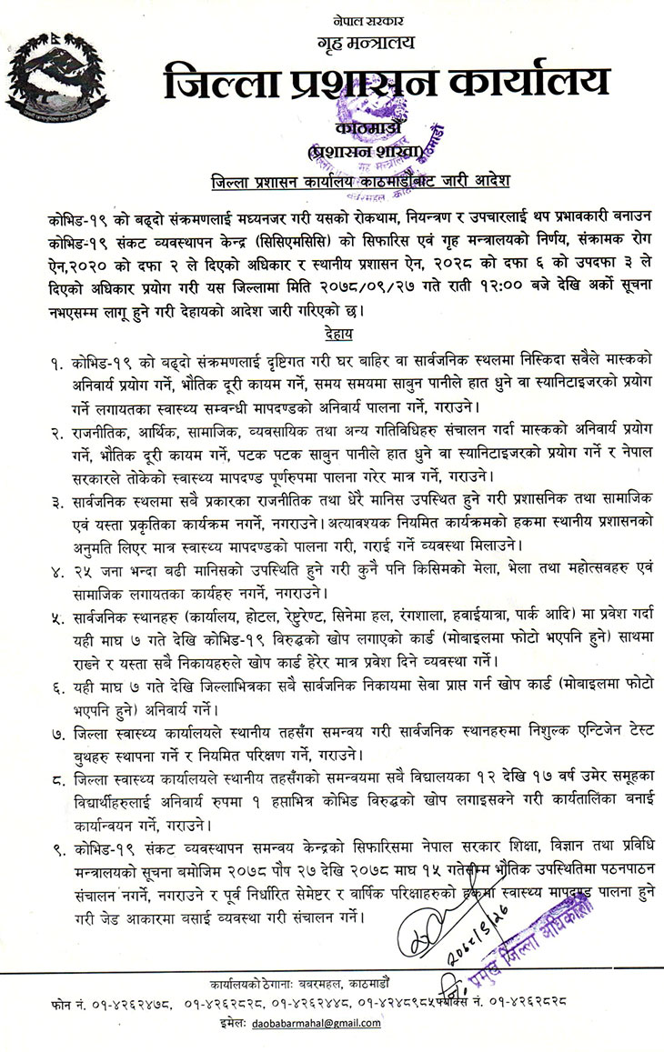 मंगलबार (२७ पुस) मध्यराति १२ बजेदेखि उपरोक्त आदेश काठमाडौं, ललितपुर र भक्तपुरका जिल्लाभर लागू गरिने भएको छ । कोरोना संक्रमण बढ्दै गएर नेपालमा तेस्रो लहर सिर्जना हुने सम्भावना देखिन थालेसँगै प्रशासनले यस्तो कदम चालेको हो ।