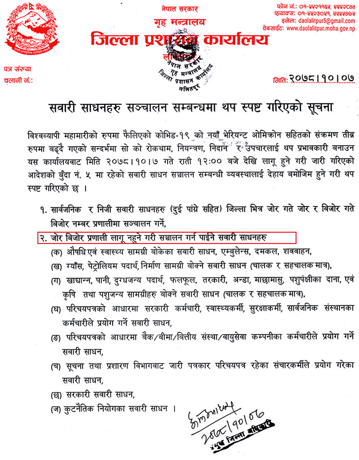 जोर–बिजोर नम्बरका आधारमा सवारी साधन सञ्चालन गर्ने स्थानीय प्रशासनको निर्णयमा अन्यौल देखिएपछि दुई जिल्ल प्रशासनले शुक्रबार फेरि विज्ञप्ति निकालेर थप स्पष्ट पारेका हुन् । पछिल्ले सूचनाअनुसार औषधि एवं स्वास्थ्य सामग्री बोकेका सवारी साधन, एम्बुलेन्स, दमकल, शवबाहन, ग्यास र पेट्रोलियम पदार्थ बोकेका सवारी साधनमा पनि जोर–बिजोर प्रणाली लागू नहुने भएको छ ।