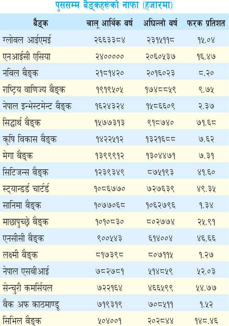 गतवर्ष सोही अवधिको तुलनामा बैङ्कहरुको नाफा ११.६३ प्रतिशतले बढेको छ भने औसत नाफा २१.२४ प्रतिशतले बढेको छ । यो वर्ष ग्लोबल आईएमई बैङ्क धेरै नाफा आर्जन गर्नेमध्ये अग्रणी बनेको छ । चालू आर्थिक वर्षको पुस मसान्तसम्ममा सो बैङ्कले २ अर्ब ६६ करोड ३३ लाख रुपियाँ खुद नाफा आर्जन गरेको हो । यो गत आर्थिक वर्षको सोही अवधिको तुलनामा १५.०४ प्रतिशत बढी हो ।