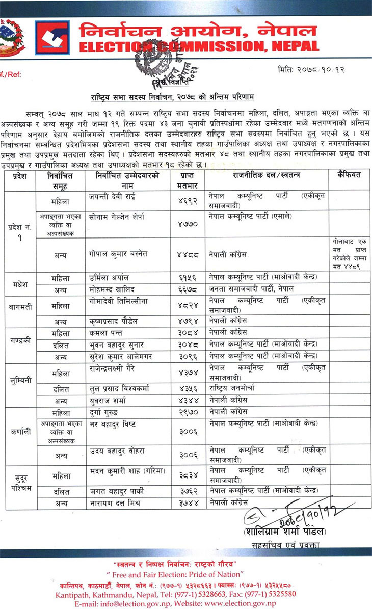 राष्ट्रियसभामा चारवर्षे कार्यकाल पूरा गरेर बिदा हुने तयारीमा रहेका १९ सांसदको रिक्त हुन जाने स्थानहरूका लागि बुधबार (१२ माघमा) विभिन्न कलस्टर गरी देशव्यापी निर्वाचन सम्पन्न भएको छ । निर्वाचन आयोगले सो निर्वाचनको अन्तिम परिणाम समेत बुधबार साँझ नै औपचारिकरूपमै सार्वजनिक गरिसकेको छ ।