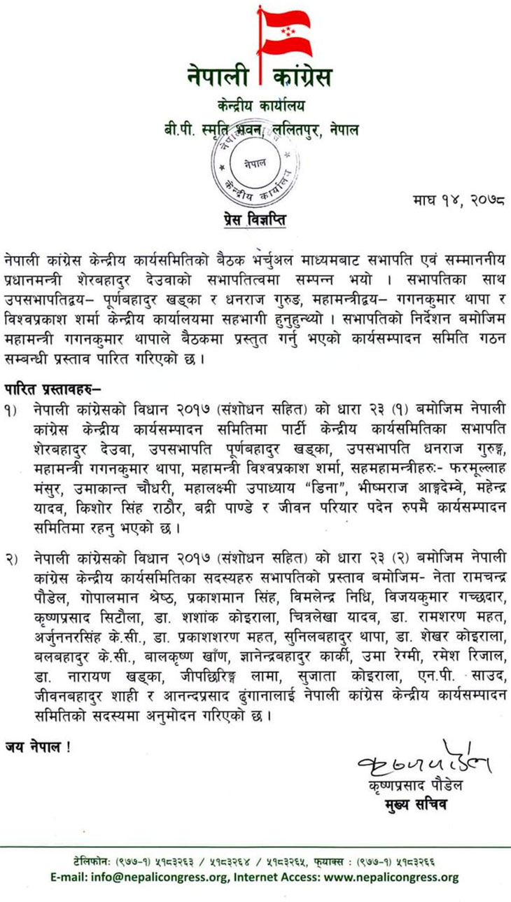नेपाली कांग्रेसले केन्द्रीय कार्यसम्पादन समिति गठन गरेको छ । शुक्रबार बसेको भर्चुअल बैठकमा सभापति शेरबहादुर देउवाले प्रस्ताव गरेका नामहरू अनुमोदन भएपछि कार्यसम्पादन समितिले औपचारिकता पाएको हो ।