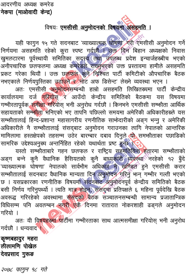 विवादास्पद एमसीसी कम्प्याक्ट प्रतिनिधिसभाबाट अनुमोदन गर्न नेकपा (माओवादी केन्द्र) ले जनाएको सहमतिविरुद्ध सो पार्टीका तीन वरिष्ठ नेताहरुले आफ्नो पार्टीभित्र औपचारिकरुपमै आ–आफ्नो असहमति दर्ज गरेका छन् । पार्टीको केन्द्रीय कार्यालयमार्फत लिखित असहमतिपत्र दर्ता गराएर सांसद् एवं पूर्वसभामुख कृष्णबहादुर महरा, नेता लीलामणि पोख्रेल र संसदीय दलका प्रमुख सचेतक देवप्रसाद गुरुङले औपचारिक असहमति दर्ज गरेका हुन् ।