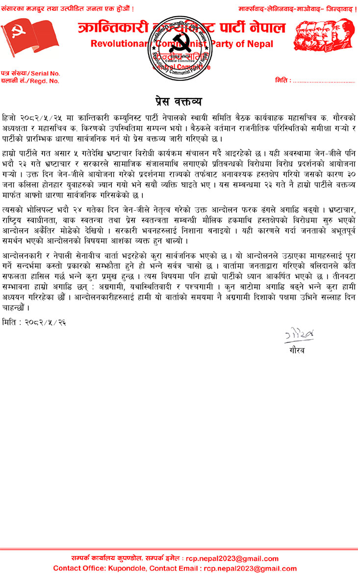 सो पार्टीका कार्यबाहक महासचिव चन्द्रप्रसाद गजुरेलले बिहीबार जारी गरेको विज्ञप्तिमा जनाइएअनुसार उक्त पार्टीको बुधबार बसेकोस्थायी समितिको बैठकले यस्तो निष्कर्ष निकालेको हो । आन्दोलनकारीलाई सुझाव दिँदै क्रान्तिकारी कम्युनिस्ट पार्टीले भनेको छ– ‘आन्दोलनकारीहरुलाई हामी यो वार्ताको समयमा नै अग्रगामी दिशाको पक्षमा उभिने सल्लाह दिन चाहन्छौँ ।’