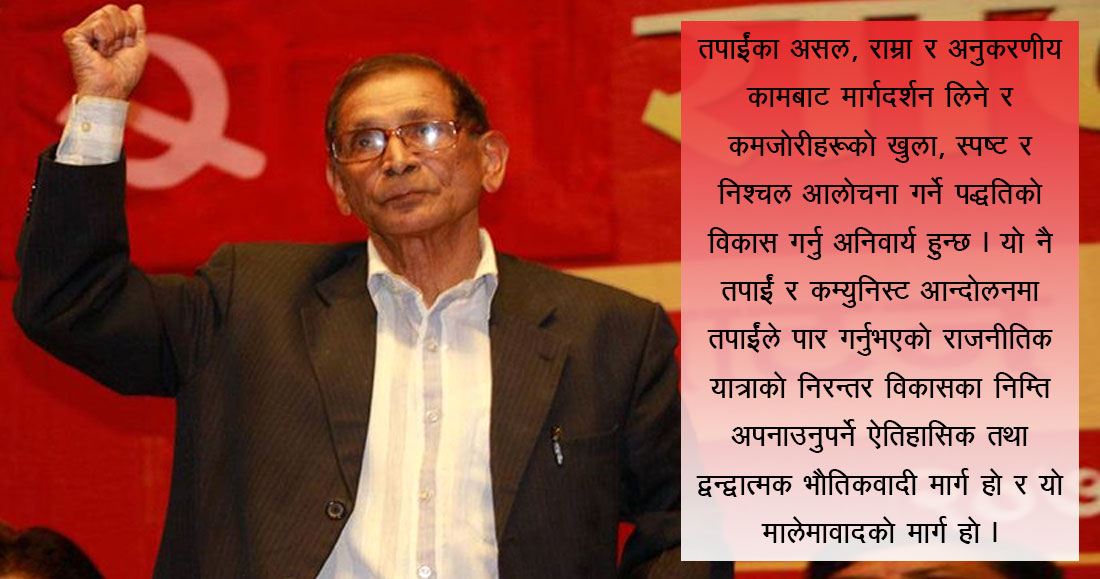 तपाईं व्यक्तिगत हिसाबले उल्लेखित समग्र विषयप्रति सचेत, जवाफदेही र जिम्मेवार हुनुहुन्छ तथापि तपाईंले कम्युनिस्ट आन्दोलनमा अपेक्षित सफलता हासिल गर्न भने सक्नुभएन। यसका पछाडिको मुख्य कारण तपाईंको वरिपरि गतिहीन र स्वार्थी जमात केन्द्रीकृत हुनु अनि कुनै न कुनै रूपले यस प्रकारका तत्त्वहरूबाट तपाईं प्रभावित हुनु नै हो भन्ने कुराको आत्मसमीक्षा स्वयम् तपाईंबाट नै हुनुपर्दछ भन्ने मलाई लाग्दछ। यसबाट मुक्त हुन सक्नुभएको भए तपाईंको नेतृत्व–छाताबाट धेरै असल, योग्य र क्रान्तिकारी नेता–कार्यकर्ता समेत अलग हुनुपर्ने परिस्थिति शायद आउने थिएन। म स्वयम् पनि तपाईंको यही कमजोरीको सिकार एक पात्र हुनुको नाताले यतिखेर यो अनुभव साझा गरिरहेको छु।