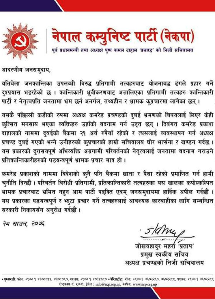 यसकै पछिल्लो कडीका रुपमा अध्यक्ष कमरेड प्रचण्डको दुबई भ्रमणको विषयलाई लिएर केही कुत्सित मनशाय भएका व्यक्तिहरु उहाँको बदनाम गर्न उद्दत छन् । दिवंगत कमरेड प्रकाश दाहालको नाममा दुबईको बैंकमा २१ अर्ब रुपैयाँ रहेको र त्यसलाई व्यवस्थापन गर्न अध्यक्ष प्रचण्ड दुबई गएको भन्ने उनीहरुको कुप्रचारको हाम्रो सचिवालय घोर भर्त्सना र खण्डन गर्दछ । यस प्रकारको दूराशयपूर्ण अभिव्यक्ति अग्रगामी परिवर्तनको नेतृत्वलाई जनतामा बदनाम गराउने प्रतिक्रान्तिकारीहरुको षडयन्त्रपूर्ण भ्रामक प्रचार मात्र हो ।