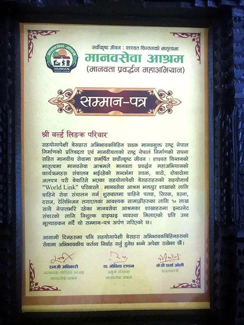 मानवसेवा आश्रम भक्तपुर शाखाको गृहप्रवेश र उदघाटन समहारोहको अवसरमा कम्पनीले यो रकम संस्थालाई हस्तान्तरण गरेको छ । उक्त अवसरमा कार्यक्रमका प्रमुख अतिथी प्रधानमन्त्री केपी शर्मा ओलीले वर्ल्डलिंकका कार्यकारी निर्देशक विजय जालानलाई सम्मानपत्र हस्तान्तरण गरे ।