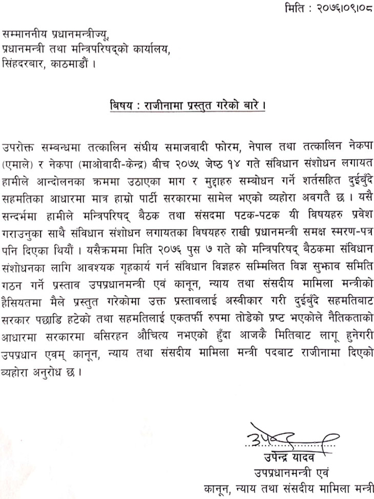समाजवादी पार्टीका अध्यक्ष समेत रहेका उपप्रधान एवं कानुन, न्याय तथा संसदीय मामिलामन्त्री उपेन्द्र यादवले पदबाट राजीनामा दिएका छन् । यादवले मंगलबार प्रधानमन्त्री केपी शर्मा ओलीलाई राजीनामा पत्र बुझाएको समाजवादी पार्टीले जनाएको छ ।