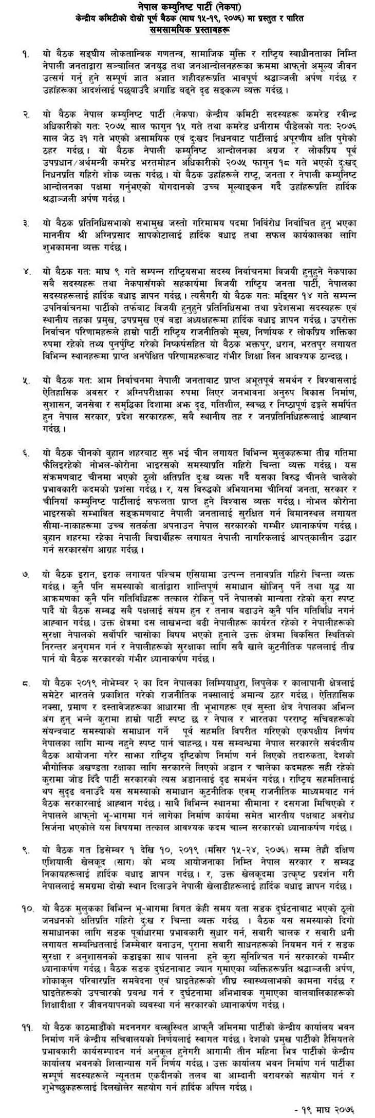 भारतले नेपालका लिम्पियाधुरा, लिपुलेक र कालापानी क्षेत्रलाई समेटेर कात्तिक १६ मा प्रकाशन गरेको राजनीतिक नक्शालाई अमान्य ठहर गर्दै ऐतिहासिक नक्शा, प्रमाण र दस्तावेजका आधारमा ती भूभाग एवं सुस्ता क्षेत्र नेपालका अभिन्न अङ्ग हुन् भन्ने कुरामा पार्टी स्पष्ट भएको निष्कर्ष बैठकले निकालेको छ । ‘नेपाल र भारतका परराष्ट्र सचिवको संयन्त्रबाट समस्याको समाधान गर्ने पूर्वसहमतिविपरीत गरिएको एकपक्षीय निर्णय नेपालका लागि मान्य नहुने स्पष्ट पार्न चाहन्छ, यस सम्बन्धमा नेपाल सरकारले सर्वदलीय बैठक आयोजना गरेर साझा राष्ट्रिय दृष्टिकोण निर्माण गर्न लिएको तदारुकता, देशको भौगोलिक अखण्डता रक्षाका लागि सरकारले लिएको अडान र चालेका कदमहरू सही रहेको कुरामा जोड दिँदै पार्टी सरकारको त्यस अडानलाई दृढ समर्थन गर्दछ,’ बैठकमा पारित प्रस्तावमा भनिएको छ– ‘राष्ट्रिय सहमतिलाई थप सुदृढ बनाउँदै यस समस्याको समाधान कूटनीतिक एवम् राजनीतिक माध्यमबाट गर्न बैठक सरकारलाई आह्वान गर्दछ । साथै, विभिन्न स्थानमा सीमाना र दशगजा मिचिएको र नेपालले आफ्नो भूभागमा गर्न लागेका निर्माण कार्यमा समेत भारतीय पक्षबाट अवरोध सिर्जना भएकाले यस विषयमा तत्काल आवश्यक कदम चाल्न सरकारको ध्यानाकर्षण गर्दछ ।’