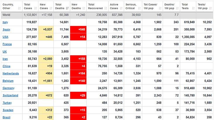 शनिबार अपराह्नसम्म यस महामारीले ६०,३९८ को ज्यान लिइसकेको छ । हालसम्म इटालीमा १४,६८१, स्पेनमा ११,७४४, अमेरिकामा ७४०६, फ्रान्समा ६,५०७, बेलायतमा ३,६०५, इरानमा ३,४५२ र चीनमा ३,३२६ जनाको कोभिड– १९ का कारणा निधन भैसकेको छ ।
