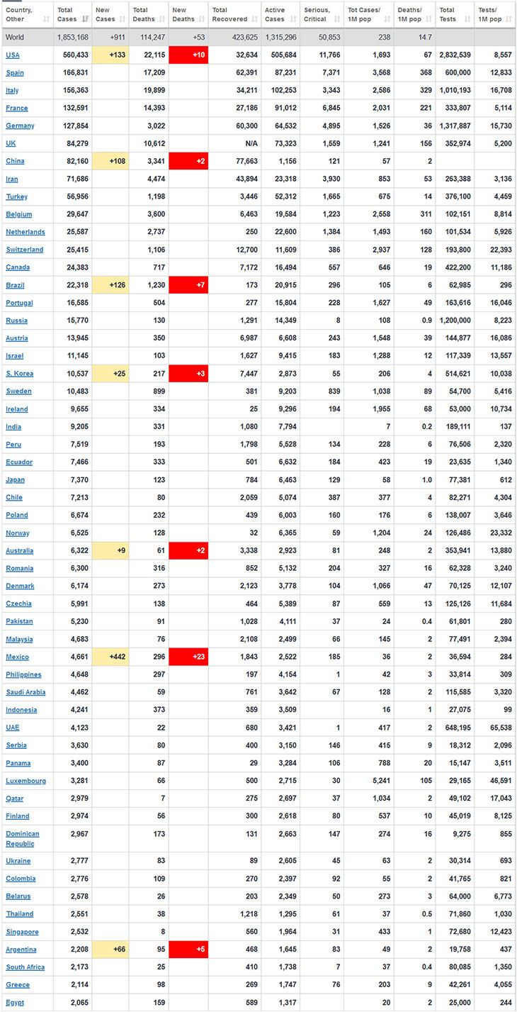 कोरोनाभाइरसबाट बढी प्रभावित देशहरूमध्ये संक्रमित संख्या र मृतक संख्या दुवै हिसाबले अमेरिका सबैभन्दा अगाडि छ । कोरोनाभाइरसकाे संक्रमणबाट आइतबार बिहानसम्म अमेरिकामा २२,११५ जना, इटालीमा १९,८९९ जना, स्पेनमा १७,२०९ जना, फ्रान्समा १४,३९३ जना, बेलायतमा १०,६१२ जना, इरानमा ४,४७३ जना, बेल्जियममा ३,६०० जना, चीनमा ३,३४१ जना, जर्मनीमा ३,०२२ जना र नेदरल्याण्डमा २,७३७ जनाको मृत्यु भैसकेको छ ।