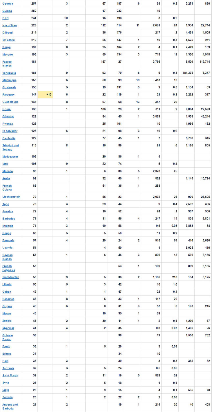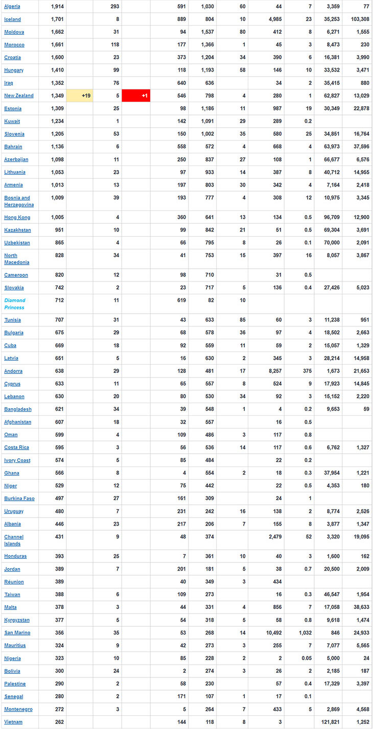 हालसम्मकाे तथ्यांकअनुसार अमेरिकामा ५,६०,४३३ जना, स्पेनमा १,६६,८३१ जना, इटालीमा १,५६,३६३ जना, फ्रान्समा १,३२,५९१ जना, जर्मनीमा १,२७,८५४ जना, बेलायतमा ८४,२७९ जना, चीनमा ८२,१६० जना, इरानमा ७१,६८६ जना र टर्कीमा ५६,९६५ जना संक्रमित भएका छन् ।