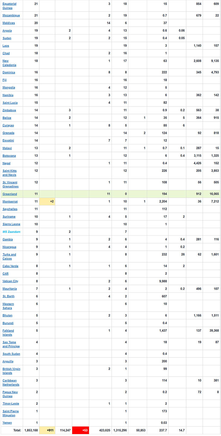 विश्व महामारीको रुप लिइरहेको कोरोनाभाइरस (कोभिड– १९) बाट साेमबार (१ वैशाख, २०७७) बिहानसम्म संसारभरमा १८,५३,१६८ जना संक्रमित भएका छन् । यो महामारीका कारण यतिबेलासम्म १,१४,२४७ जनाले ज्यान गुमाइसकेका छन् । काेराेना संक्रमण निको हुनेको संख्या ४,२३,६२५ रहेको छ भने १३,१५,२९६ जना उपचाररत छन् । उपचार गराइरहेकामध्ये ५०,८५३ को अवस्था गम्भीर (क्रिटिकल) रहेको वर्ल्डाेमिटरले जनाएकाे छ ।