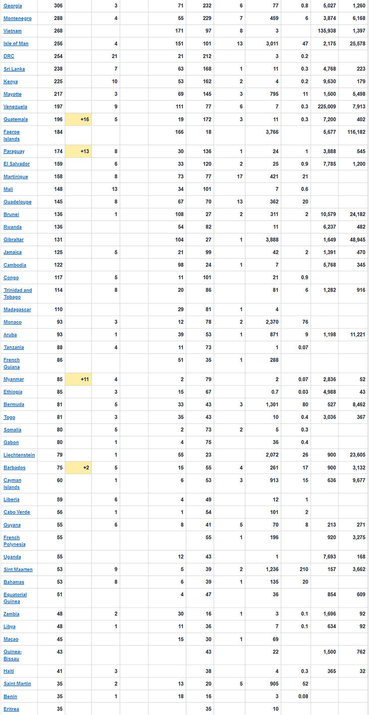 हालसम्मकाे तथ्यांकअनुसार अमेरिकामा ६,४४,०८९ जना, स्पेनमा १,८०,६५९ जना, इटालीमा १,६५,१५५ जना, फ्रान्समा १,४७,८६३ जना, जर्मनीमा १,३४,७५३ जना, बेलायतमा ९८,४७६ जना, चीनमा ८२,३४१ जना, इरानमा ७६,३८९ जना र टर्कीमा ६९,३९२ जना संक्रमित भएका छन् ।
