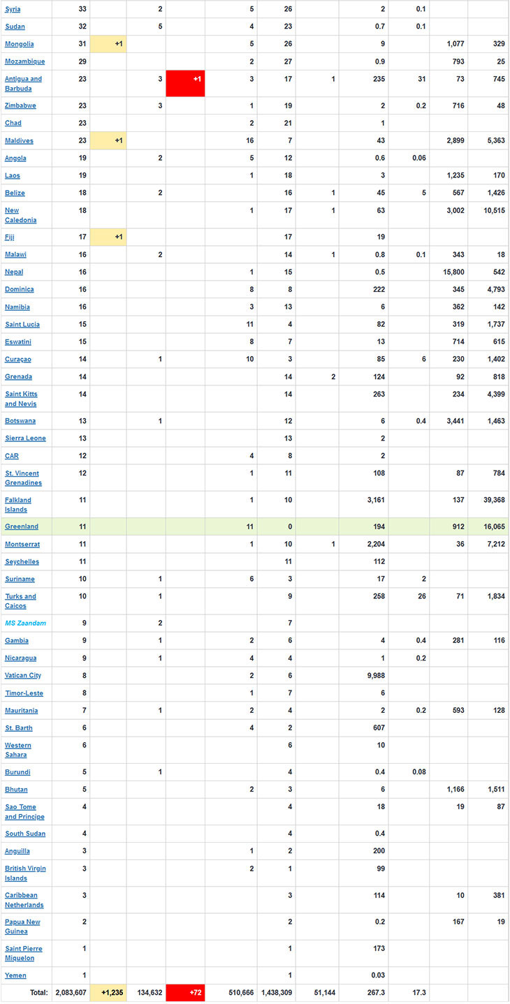 विश्व महामारीको रुप लिइरहेको कोरोनाभाइरस (कोभिड– १९) बाट बिहीबार (४ वैशाख, २०७७) बिहानसम्म संसारभरमा २०,८३,६०७ जना संक्रमित भएका छन् । यो महामारीका कारण यतिबेलासम्म १,३४,६३२ जनाले ज्यान गुमाइसकेका छन् । काेराेना संक्रमण निको हुनेको संख्या ५,१०,६६६ रहेको छ भने १४,३८,३०९ जना उपचाररत छन् । उपचार गराइरहेकामध्ये ५१,१४४ को अवस्था गम्भीर (क्रिटिकल) रहेको वर्ल्डाेमिटरले जनाएकाे छ ।