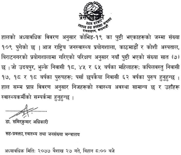 कोरोनाभाइरस (कोभिड– १९) संक्रमितको संख्या १०९ पुगेको छ । काठमाडौंस्थित राष्ट्रिय जनस्वास्थ्य प्रयोगशाला र कोशी अस्पतालमा गरिएको परीक्षणबाट शनिबार थप ७ जनामा कोरोना संक्रमण पुष्टि भएसँगै संक्रमितको संख्या १०९ पुगेको स्वास्थ्य तथा जनसंख्या मन्त्रालयले जनाएको छ । यसअघि शुक्रबार एक जनामा कोरोना संक्रमण पुष्टि भएको थियो ।