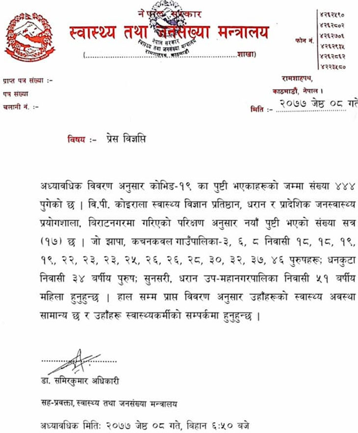 स्वास्थ्य तथा जनसंख्या मन्त्रालयका सहप्रवक्ता डा. समिरकुमार अधिकारीद्वारा बिहीबार बिहान ६ः५० बजे जारी गरिएको विज्ञप्तिमा जनाइएअनुसार बी.पी. कोइराला स्वास्थ्य विज्ञान प्रतिष्ठान, धरान र प्रादेशिक जनस्वास्थ्य प्रयोगशाला, विराटनगरमा गरिएको परीक्षणअनुसार नयाँ १७ जना संक्रमित पुष्टि भएका हुन् ।