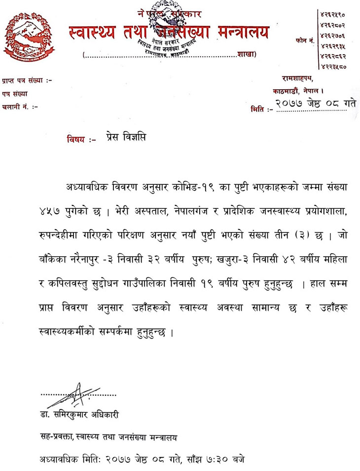 स्वास्थ्य तथा जनसंख्या मन्त्रालयका सहप्रवक्ता डा. समिरकुमार अधिकारीले साँझ साढे ७ बजे प्रकाशित गरेको विज्ञप्तिमा जनाइएअनुसार भेरी अस्पताल नेपालगञ्ज र प्रादेशिक जनस्वास्थ्य प्रयोगशाला रूपन्देहीमा गरिएको परीक्षणअनुसार बाँकेका नरैनापुर– ३ निवासी ३२ वर्षीय पुरूष, खजुरा– ३ निवासी ४२ वर्षीया महिला र कपिलवस्तुको शुद्धोधन गाउँपालिका निवासी १९ वर्षीय पुरूषमा कोभिड– १९ को पुष्टि भएको हो ।
