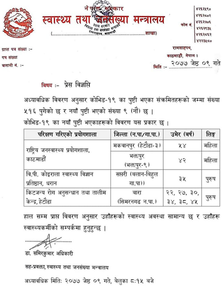 यसअघि मन्त्रालयले साढे ४ बजे दिएकाे जानकारीअनुसार संक्रमितकाे संख्या ५०७ थियाे । त्यसयता फेरि थप ९ जनामा संक्रमण पुष्टि भएकाे हाे । हालसम्म ७० जना संक्रमित भने निकाे भएर अस्पतालबाट डिस्चार्ज भैसकेका छन् । काेभिड– १९ काे संक्रमण पुष्टि भएका ३ जनाकाे मृत्यु समेत भैसकेकाे छ ।