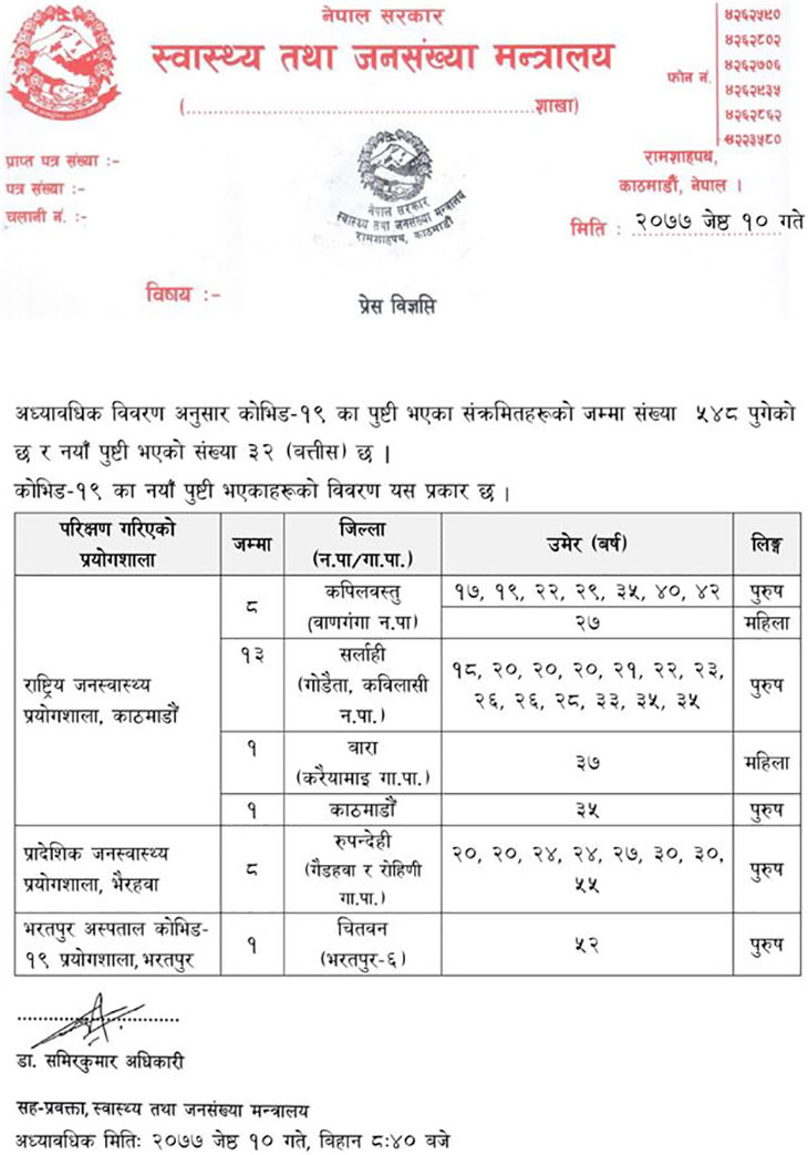 स्वास्थ्य तथा जनसंख्या मन्त्रालयका सहप्रवक्ता डा. समिरकुमार अधिकारीले शनिबार बिहान ८ः४० मा जारी गरेको विज्ञप्तिमा जनाइएअनुसार कपिलवस्तुमा ७ पुरूष र एक महिला गरी आठ, सर्लाहीमा १३ पुरूष, बारामा एक महिला, काठमाडौंमा एक पुरूष, रूपन्देहीमा ८ पुरूष र चितवनमा १ पुरूष गरी ३२ जना नयाँ संक्रमितहरूको पुष्टि भएको हो ।