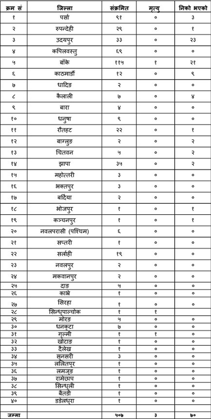 शुक्रबार दिउँसो साढे ४ बजेसम्म पुष्टि भएका ५०७ संक्रमितको आधारमा स्वास्थ्य तथा जनसंख्या मन्त्रालयले सार्वजनिक गरेको सोही समयसम्मको जिल्लागत विवरण यसप्रकार छ–