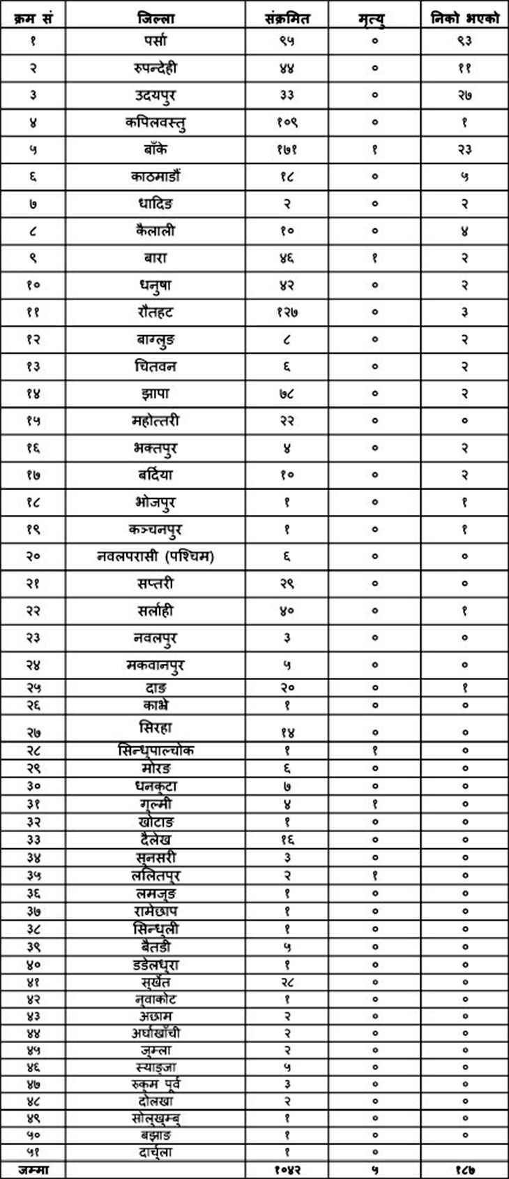 जिल्लागत विवरण : कहाँ कति संक्रमित, कति निकाे भए, कतिकाे मृत्यु ?