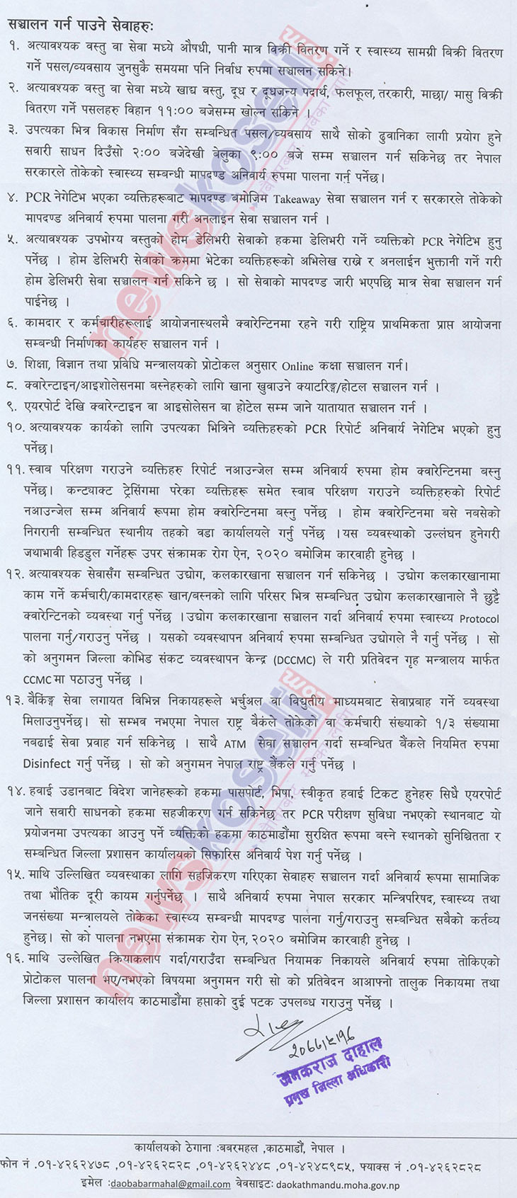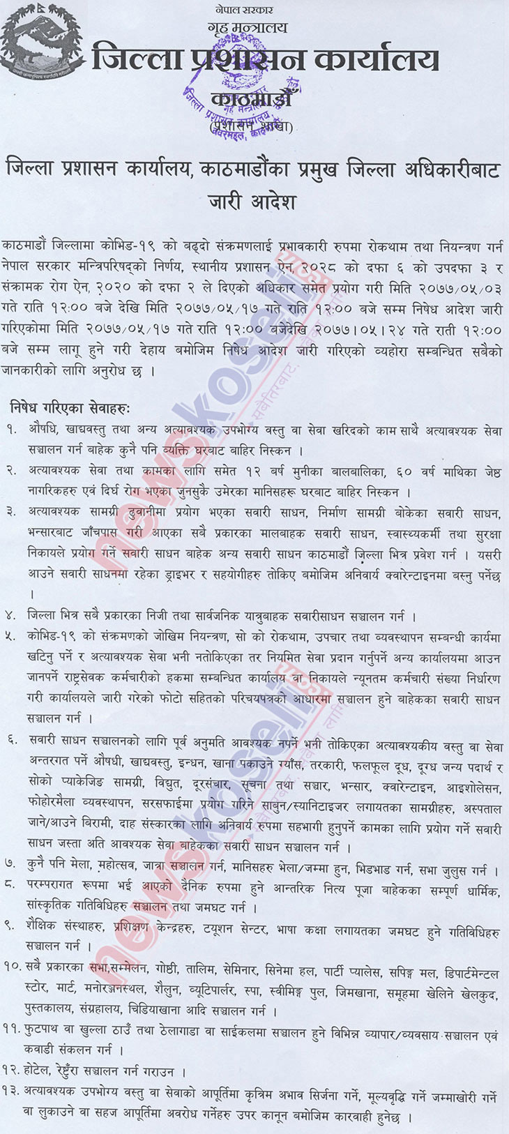 बुधबार बसेको तीन सीडीओको बैठकले दुई साता अघिदेखि लगाउँदै आएको निषेधाज्ञाकाे तेस्राे सातामा गर्न पाइने र नपाइने विषय र खुल्ने र नखुल्ने क्षेत्र परिमार्जन गरेकाे छ । थप एक साता (तेस्रो साताका लागि) लम्ब्याइएकाे निषेधाज्ञाबीच गर्नु हुने र नहुने कार्यबारे बुधबार साँझ काठमाडौंका प्रजिअ जनकराज दाहालद्वारा जारी आदेशको पूर्णपाठ यसप्रकार छ–