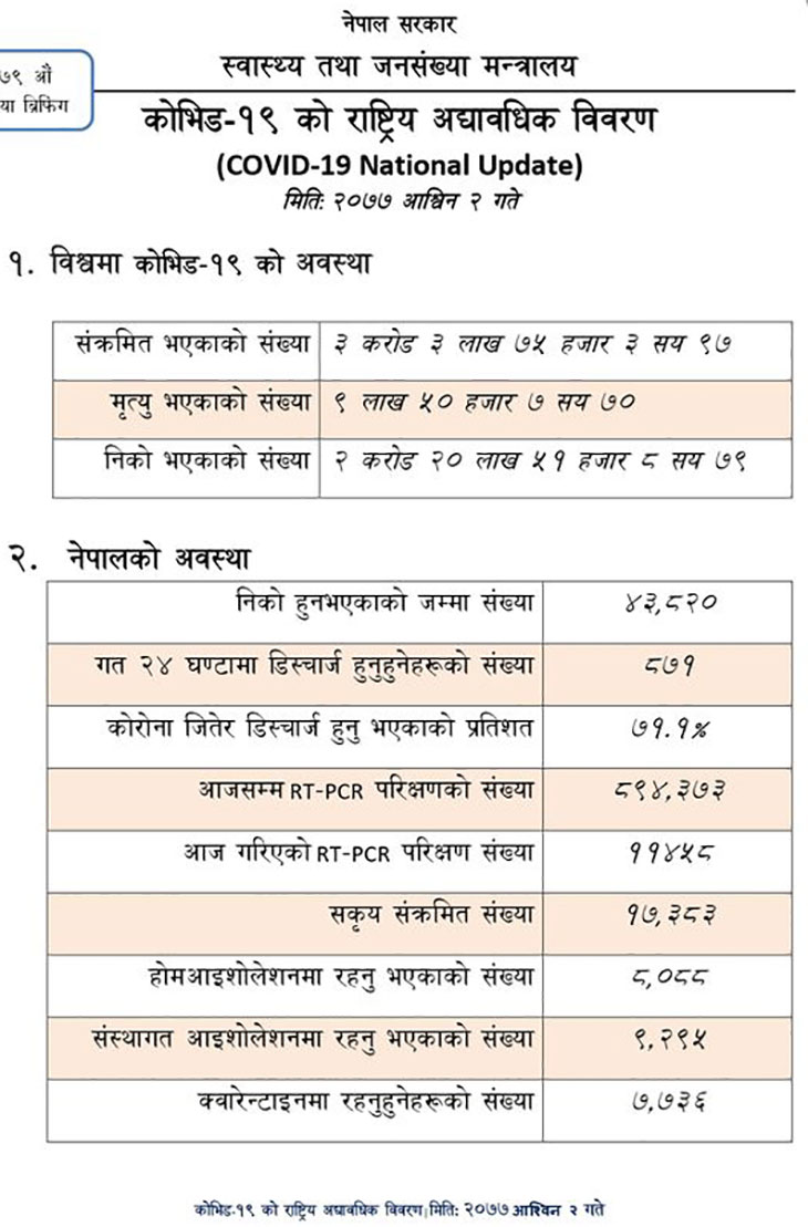 मन्त्रालयका प्रवक्ता प्राडा जागेश्वर गौतमले शुक्रबारको नियमित मेडिया ब्रिफिङमा दिएको जानकारीअनुसार यतिबेला देशभर १७ हजार ३ सय ८३ जना सक्रिय संक्रमित छन् । यीमध्ये ९ हजार २ सय ९५ जना संस्थागत आइसोलेसनमा र ८ हजार ८८ जना होम आइसोलेसनमा रहेका छन् । १ सय ७३ जना आईसीयूमा र ३६ जना भेन्टिलेटरमा उपचाररत छन् ।