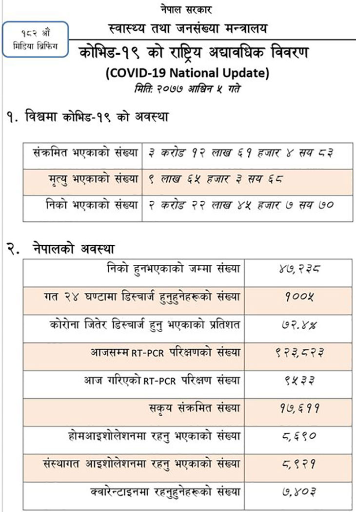 पछिल्लो २४ घन्टामा देशभर थप १६ जना कोरोना संक्रमितको मृत्यु भएको छ भने यसअघि संक्रमण पुष्टि भएकामध्ये १००५ जना आइसोलेसनबाट डिस्चार्ज भएका छन् । सक्रिय संक्रमितमध्ये ८,९२१ जना संस्थागत आइसोलेसनमा र ८,६९० जना होम आइसोलेसनमा रहेको मन्त्रालयले जनाएको छ ।
