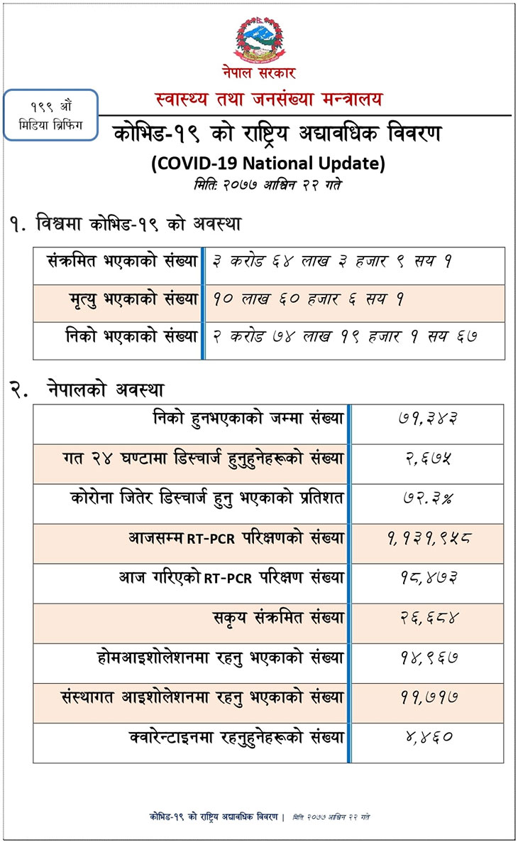 पछिल्लो २४ घन्टामा ४ महिला र ८ पुरुष गरी थप १२ जना कोरोना संक्रमितको मृत्यु भएको छ भने २,६७५ जना आइसोलेसनबाट डिस्चार्ज भएका छन् । काठमाडौंमा ७९ वर्षीया, ललितपुरमा ७३ वर्षीया, भक्तपुरमा ८२ वर्षीया र सुर्खेतमा ८२ वर्षीया महिलाको मृत्यु भएको मन्त्रालयले जनाएको छ ।