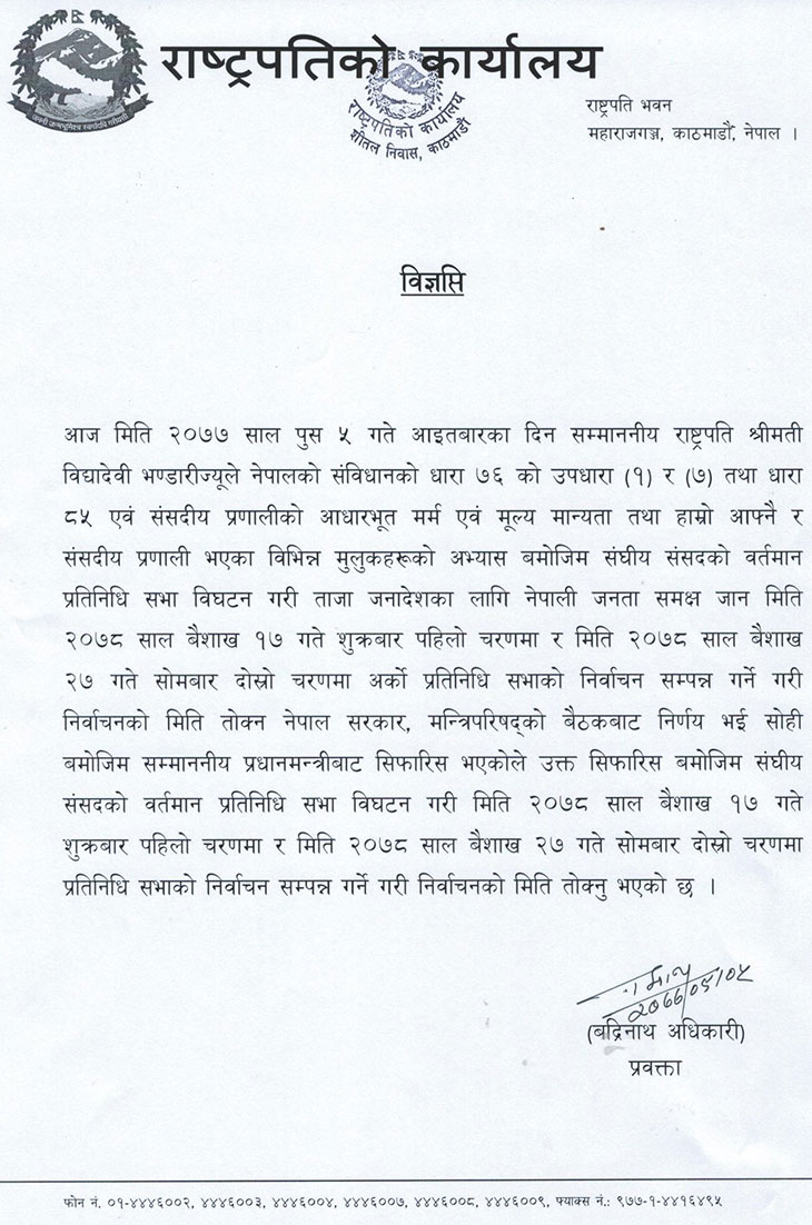 राष्ट्रपति भण्डारीले भने संविधानको धारा ७६ को उपधारा १ र ७ तथा धारा ८५ तथा ‘संसदीय प्रणालीको आधारभूत मर्म एवं मूल्य–मान्यताबमोजिम’ भन्दै संसद विघटनको घोषणा गरिदिएकी छन् । ‘मन्त्रिपरिषदको सिफारिसबमोजिम ताजा जनादेशका लागि २०७८ वैशाख १७ गते पहिलो चरण र २७ गते दोस्रो चरणमा प्रतिनिधिसभाको निर्वाचन’ समेत राष्ट्रपतिले तोकेकी छन् ।