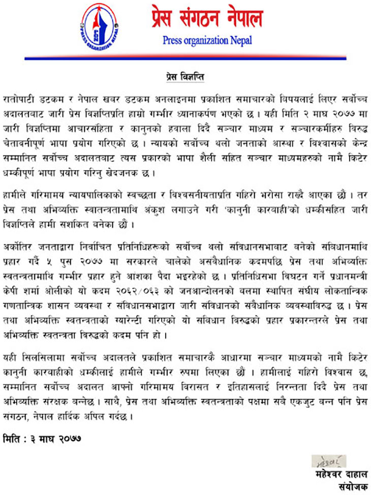 सर्वोच्चले निकालेको सो विज्ञप्तिप्रति आपत्ति जनाउँदै प्रेस संगठन नेपालले शनिबार आपत्ति जनाएको छ । सर्वोच्चको ‘धम्कीपूर्ण’ सो विज्ञप्ति लोकतान्त्रिक गणतन्त्र र वर्तमान संविधान एवं अहिलेको प्रेस तथा अभिव्यक्ति स्वतन्त्रताको मर्मअनुकूल नभएको संगठनका अध्यक्ष महेश्वर दाहालले उल्लेख गरेका छन् ।