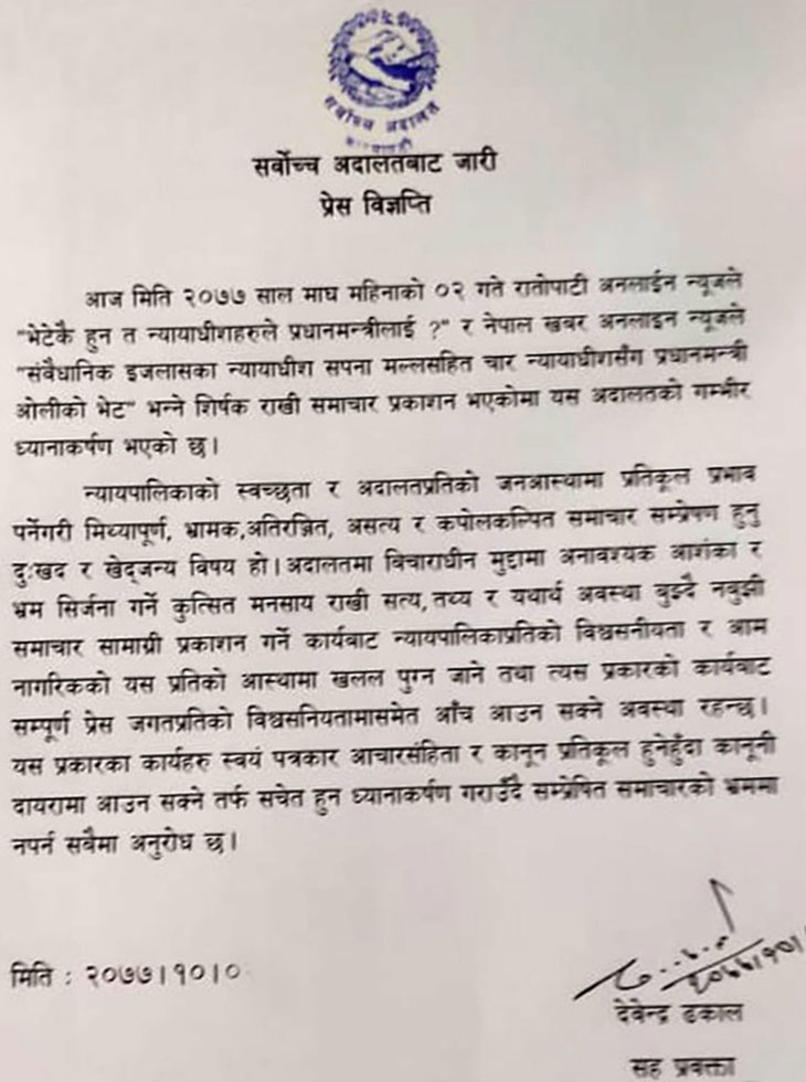 आम जनचासोको विषय, राष्ट्रिय महत्त्वको सवाल र जनमानसबीच व्यापक चर्चामा आएको विषयमा शुक्रबार रातोपाटी डटकम र नेपालखबर डटकमले प्रकाशित गरेको समाचारलाई लिएर सर्वोच्च अदालतले शुक्रबारै ती दुई सञ्चार माध्यमको नामै किटेर ‘धम्कीपूर्ण’ विज्ञप्ति प्रकाशित गरेको छ ।