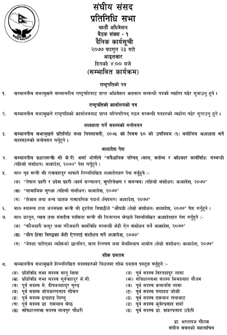 यसअघिका अधिवेशनको सुरु हुँदा जस्तै आइतबारको पहिलो बैठकमा पनि अधिवेशन आह्वान गर्दै राष्ट्रपति कार्यालयबाट पठाइएको पत्र पढेर सुनाउने अनि प्रतिनिधिसभामा प्रतिनिधित्व गर्ने दलहरुका शीर्ष नेताले मन्तव्य दिने कार्यक्रम छ । अधिवेशन प्रारम्भ हुनुअघि बस्ने कार्यव्यवस्था परामर्श समितिको बैठकले कार्यसूचीलाई अन्तिम रुप दिने बताइएको छ ।