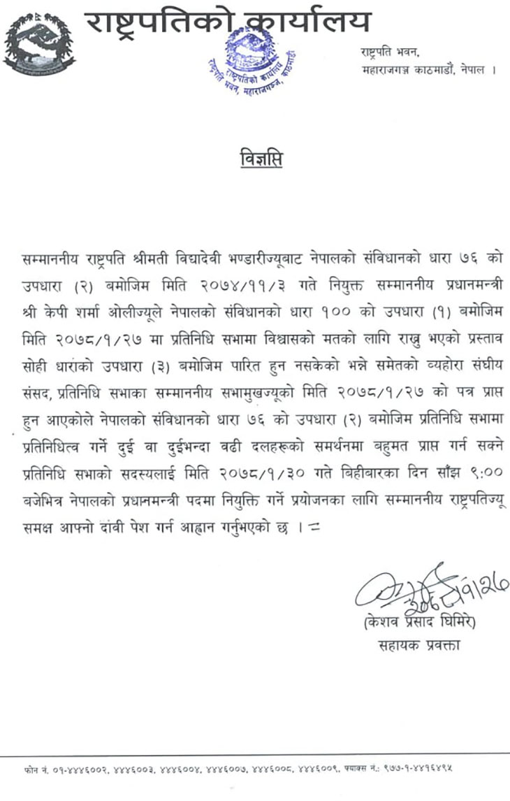 प्रधानमन्त्री खड्ग ओली पदमुक्त भएपछि बहुमतको सरकार गठनका लागि राष्ट्रपति विद्यादेवी भण्डारीले आह्वान गरेकी छन् । प्रधानमन्त्री ओली प्रतिनिधिसभाबाट विश्वासको मत लिन नसकेपछि सोमबार अपराह्न पदमुक्त भएका हुन् । ओलीले विश्वासको मत लिन नसकेको कुरा संसद् सचिवालयले जानकारी गराएलगत्तै राष्ट्रपति भण्डारीले संविधानको धारा ७६ (२) अनुसार तीन दिनभित्र बहुमतको सरकार गठनका लागि आह्वान गरेकी हुन् ।