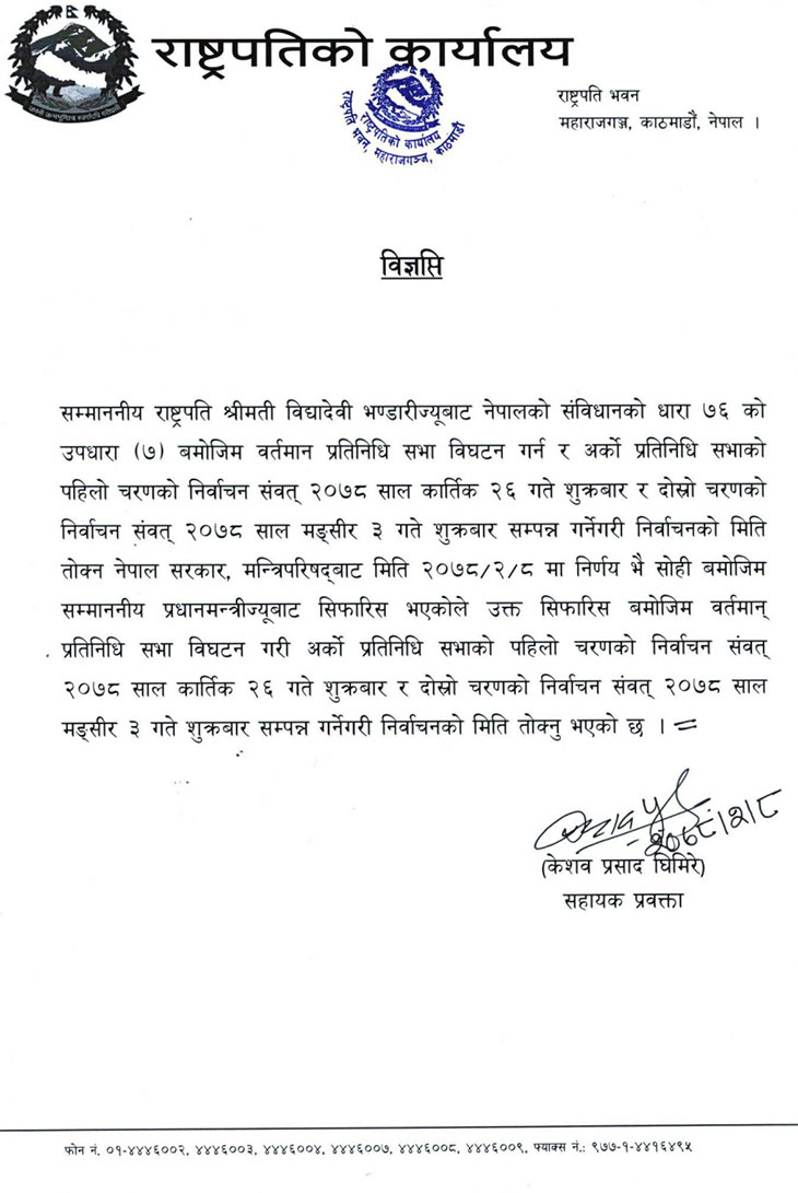 राष्ट्रपति विद्यादेवी भण्डारीले प्रतिनिधिसभा भंग गरिदिएकी छन् । शुक्रबार मध्यरात बाह्र बजेपछि प्रधानमन्त्रीको सरकारी निवास बालुवाटारमा बसेको मन्त्रिपरिषदको बैठकले प्रतिनिधिसभा भंग गरी मध्यावधि निर्वाचनको घोषणा गर्न राष्ट्रपतिसमक्ष सिफारिस गरेको केही बेरमै राष्ट्रपतिले प्रतिनिधिसभा भंग गरी कात्तिक २६ र मंसिर ३ गरी दुई चरणमा निर्वाचनको घोषणा गरेकी हुन् ।