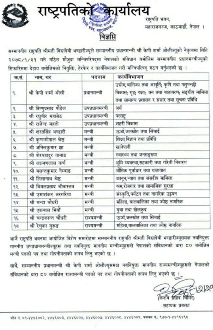 - केपी शर्मा ओली– प्रधानमन्त्री; रक्षा, गृह, सञ्चार, पर्यटन, कृषि, उद्योग वाणिज्य र सामान्य प्रशासन