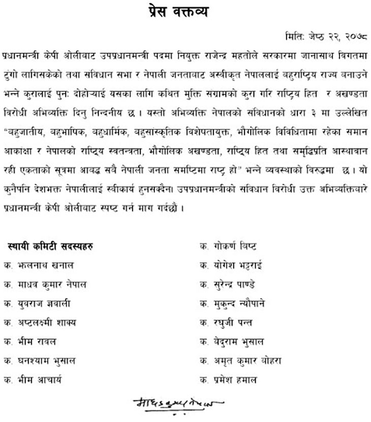 वरिष्ठ एमाले नेता माधवकुमार नेपालसहित स्थायी कमिटीका १५ नेताले शनिबार संयुक्त वक्तव्य जारी गर्दै नेपाली जनताबाट अस्वीकृत बहुराष्ट्रिय राज्य बनाउने भन्ने कुरालाई महतोले पुनः उठाएकोमा आपत्ति जनाएका हुन् । ‘विगतमा टुंगो लागिसकेको तथा संविधानसभा र नेपाली जनताबाट अस्वीकृत नेपाललाई बहुराष्ट्रिय राज्य बनाउने भन्ने कुरालाई पुनः दोहोर्याई यसका लागि कथित मुक्ति संग्रामको कुरा गरी राष्ट्रिय हित र अखण्डताविरोधी अभिव्यक्ति दिनु निन्दनीय छ’– संयुक्त वक्तव्यमा उल्लेख छ ।