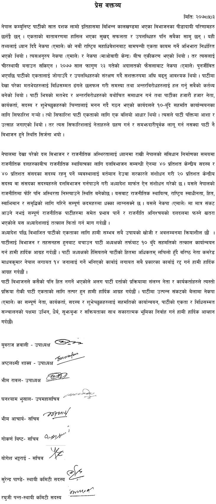उता, युवराज ज्ञवाली, अष्टलक्ष्मी शाक्य, भीम रावल, घनश्याम भुसाल, भीम आचार्य, गोकर्ण विष्ट, योगेश भट्टराई, सुरेन्द्र पाण्डे र रघुजी पन्त गरी ९ नेताले भने बिहीबार साँझ संयुक्त विज्ञप्ति जारी गर्दै १० बुँदे सहमति कार्यान्वयन नहुँदा पार्टी फुटेको दावी गरेका छन् । ओली–नेपाल दुवैले ‘सच्चिएर’ १० बुँदेलाई अक्षरसः पालना गरी पार्टी एकता जोगाउनुपर्ने उनीहरूको जिकिर छ ।