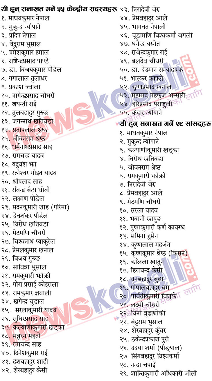 आयोगको रेकर्डमा रहेका एमालेका कूल २०३ मध्येका ५५ केन्द्रीय सदस्यले एकीकृत समाजवादीका पक्षमा सनाखत गरे । त्यसैगरी, एमालेका १५४ संघीय सांसदमध्येका २९ जनाले पनि सनाखत गरे । तलकाे सूचीमा उल्लेखित भएकाको सनाखत निर्वाचन आयोगले तोकेअनुरुप नै भएको छ । तीबाहेक पूर्वप्रधानमन्त्री एवं वरिष्ठ नेता झलनाथ खनाल उपचारका क्रममा भारतमा रहेकाले उनले भारतबाटै दूतावासमार्फत सनाखत गरी पठाएका छन् । दल दर्ताका लागि २ भदाैमा निवेदन दिँदा नाम समावेश भएका केन्द्रीय सदस्यद्वय भास्कार काफ्ले र रविन कोइराला भने सनाखतका लागि आयोगमा गएनन् ।