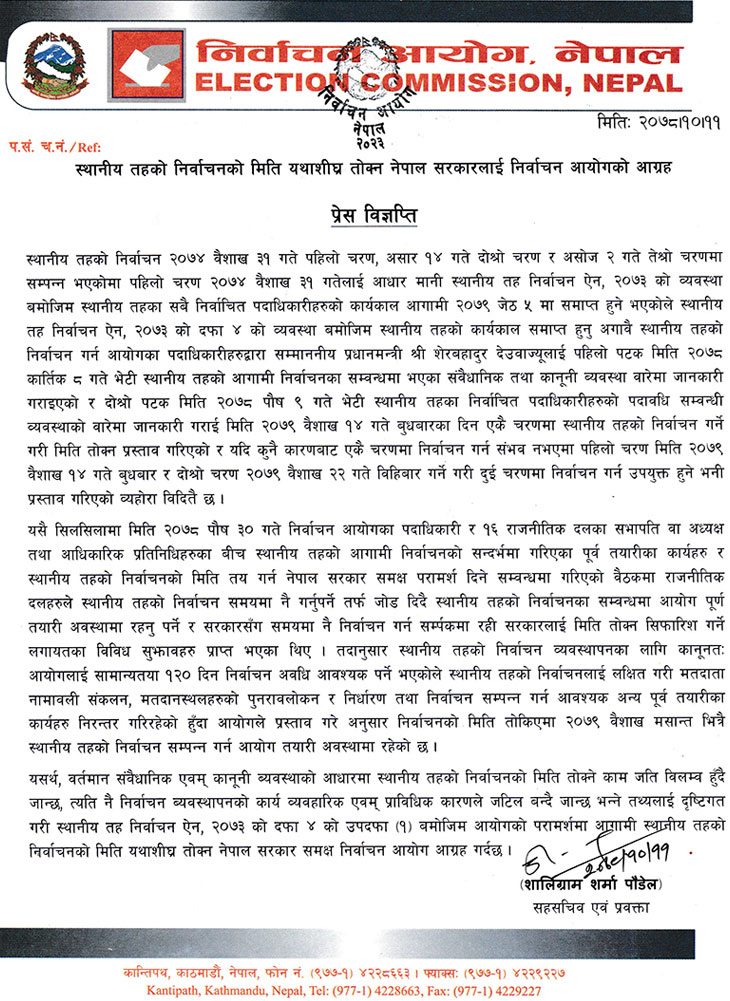 यसै मेसोमा आफ्नो सामान्य मर्यांदा समेत नाघेर निर्वाचन आयोगले मंगलबार सार्वजनिक विज्ञप्ति निकालेको छ । जसरी भए पनि आगामी वैशाख मसान्तभित्रै स्थानीय निर्वाचन गराइसक्ने गरी मिति तोक्न सो विज्ञप्तिमार्फत आयोगले सरकारलाई दबाव दिएको छ । आयोगको सो विज्ञप्ति सार्वजनिक भएसँगै ‘निर्वाचन आयोग कोद्वारा परिचालित छ हँ’ भन्दै सर्वत्र प्रश्न उब्जिएको छ ।